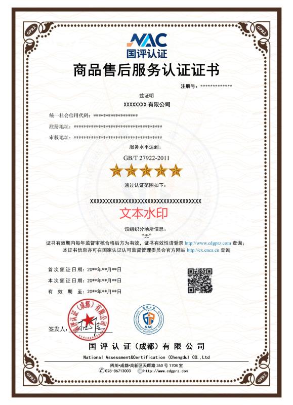 GB/T27922商品售后服务评价体系认证是服务认证类别,颁发“服务认证证书”。《商品售后服务评价体系》(GB/T27922)标准是一个评价性质的标准,认证目的是评出优秀。认证的结果是证明企业按照标准实施了售后服务,并达到了某一个高度(星级)。适用于中华人民共和国境内生产型企业和销售服务型企业的售后服务水平的评价。建立该体系的目的主要在于客观反应我国企业售后服务工作的现实状况,准确衡量企业售后服务的实际水平,发现并克服售后服务工作中的不足,促进企业售后服务工作的改进。