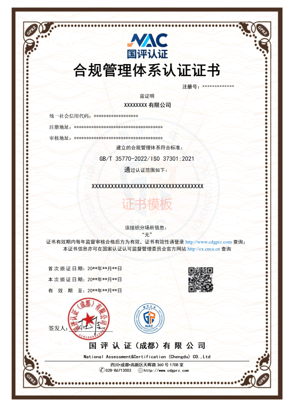 合规管理体系认证是第三方专业认证机构,通过合格评定技术,对企业的合规体系建设及管理能力进行评估,并提供第三方证明。企业通过该认证,表明其合规管理体系建设及管理能力已满足相关标准或技术规范的要求,得到了专业机构的背书。