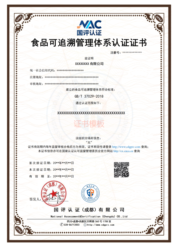 食品可追溯性管理体系认证证书是企业通过建立并实施从农田到餐桌的全程可追溯体系,以确保食品安全和提升企业形象的重要资质。该认证依据GB/T 37029-2018《食品溯源 信息记录要求》和相关标准(如GB/T 38159-2019、CTS Q/ZG014-2022等)进行,旨在实现食品供应链各环节的信息记录和追溯,确保食品安全可控。